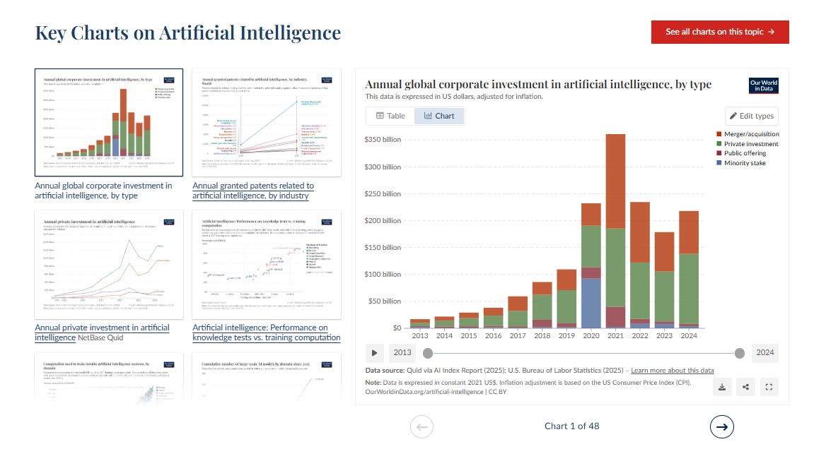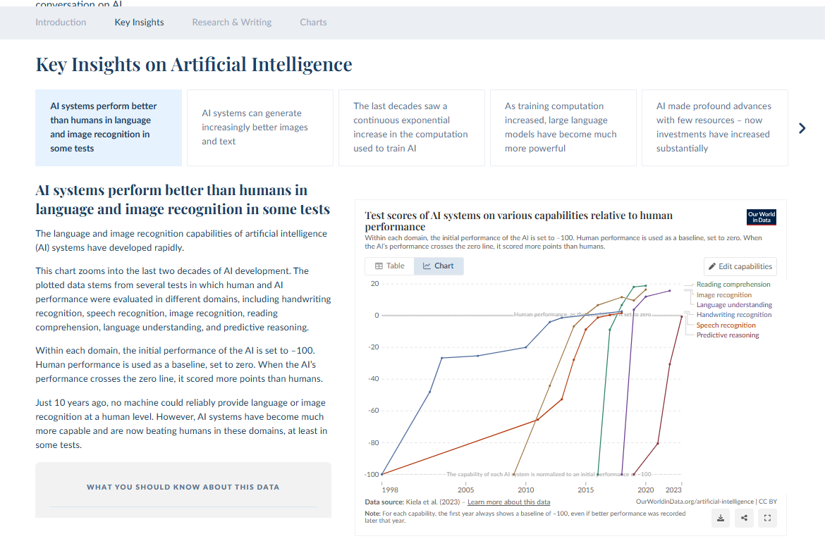 I clicked on “Artificial Intelligence” and on that webpage you’re provided with the latest datasets, research, writing on the subject, and infographics.