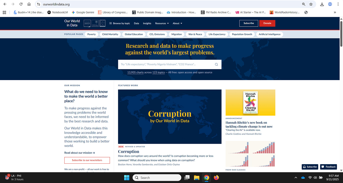 As you can see on the toolbar, there many ways to browse the website. Next to “Popular Pages” is listed “Poverty” “Child Mortality” “Global Education” “CO₂ Emissions” “Migration” “War and Peace” “Life Expectancy” “Population Growth” and “Artificial Intelligence.”